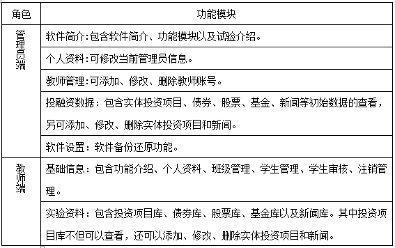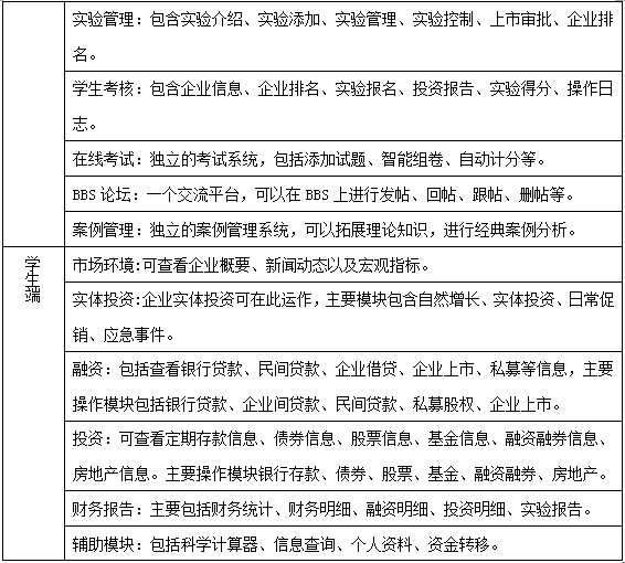 投(tou)融(rong)資(zi)(zi)(zi)決(jue)策實驗(yan)是由(you)學生扮演各(ge)種(zhong)企(qi)業(ye),教師(shi)給定企(qi)業(ye)的初始資(zi)(zi)(zi)金(jin),分為固定資(zi)(zi)(zi)產(chan)和流動資(zi)(zi)(zi)金(jin)兩部分,學生可以(yi)合理分配流動資(zi)(zi)(zi)金(jin),利用銀行(xing)存款(kuan)、銀行(xing)貸款(kuan)、債券、股票、基金(jin)、融(rong)資(zi)(zi)(zi)融(rong)券、房地產(chan)、企(qi)業(ye)間貸款(kuan)、民間貸款(kuan)、私募(mu)股權(quan)、企(qi)業(ye)上市等投(tou)融(rong)資(zi)(zi)(zi)手段,積累實體投(tou)資(zi)(zi)(zi)資(zi)(zi)(zi)金(jin)。