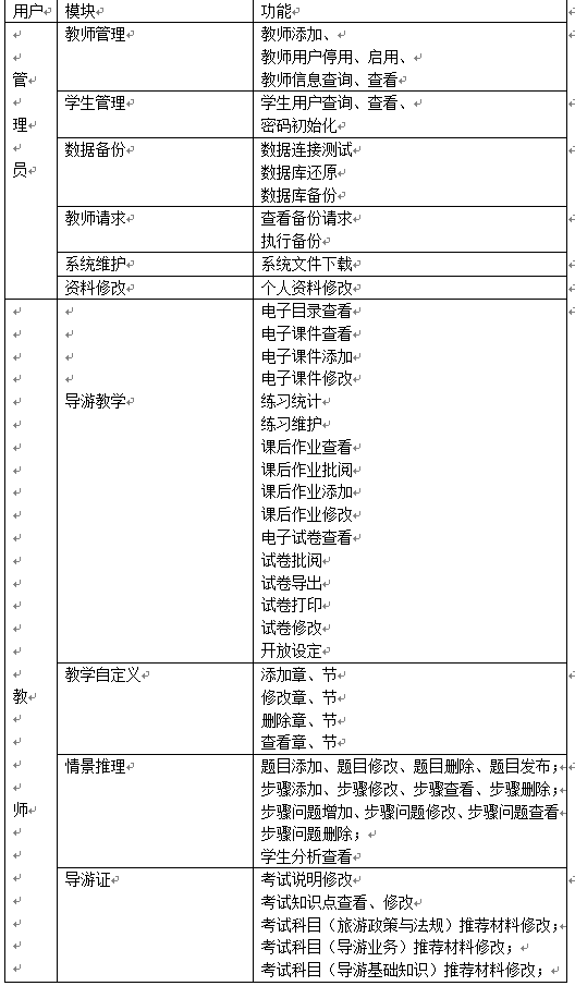 該導游業(ye)務(wu)與(yu)技(ji)能(neng)(neng)教學軟(ruan)件在功能(neng)(neng)上,以管理員、教師端(duan)、學生(sheng)端(duan)三(san)種權限設置各自功能(neng)(neng),完全能(neng)(neng)滿足旅游業(ye)務(wu)與(yu)機能(neng)(neng)教學要求。平臺通過(guo)精彩(cai)的(de)(de)內容、強大(da)的(de)(de)功能(neng)(neng)、友(you)好的(de)(de)界面,可靠的(de)(de)性能(neng)(neng),實(shi)現導游業(ye)務(wu)與(yu)機能(neng)(neng)教學的(de)(de)時代性跨越。