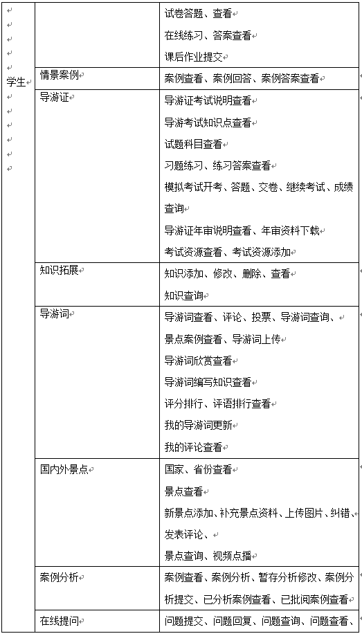 學(xue)(xue)生(sheng)的(de)主要功(gong)能(neng)是導游教(jiao)學(xue)(xue)知識的(de)學(xue)(xue)習(xi)(xi)、完成情景(jing)(jing)推理中包含的(de)案例及(ji)題目、導游證考試學(xue)(xue)習(xi)(xi)及(ji)模(mo)擬考試、導游拓展知識學(xue)(xue)習(xi)(xi),同時可添加(jia)新的(de)知識供其他同學(xue)(xue)學(xue)(xue)習(xi)(xi)、導游詞學(xue)(xue)習(xi)(xi)并編(bian)寫導游詞、國內外景(jing)(jing)點學(xue)(xue)習(xi)(xi)、案例分析和(he)在線提問。