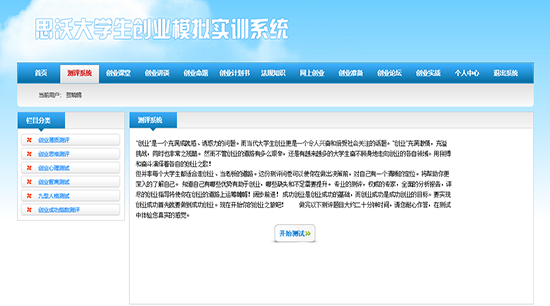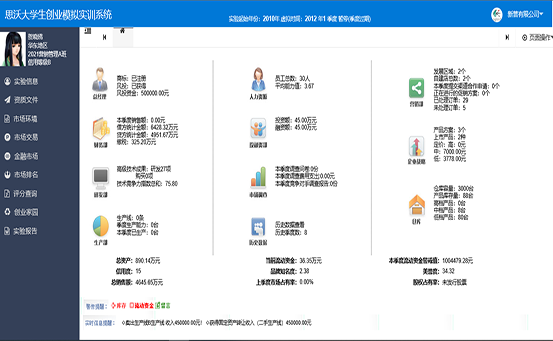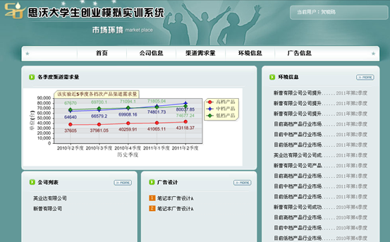 思(si)沃大(da)學(xue)(xue)(xue)(xue)(xue)生創(chuang)(chuang)(chuang)(chuang)(chuang)業(ye)(ye)(ye)(ye)(ye)(ye)模擬實訓平臺(tai)系統從大(da)學(xue)(xue)(xue)(xue)(xue)生創(chuang)(chuang)(chuang)(chuang)(chuang)業(ye)(ye)(ye)(ye)(ye)(ye)的(de)(de)(de)(de)(de)現狀分析(xi),將創(chuang)(chuang)(chuang)(chuang)(chuang)業(ye)(ye)(ye)(ye)(ye)(ye)教育(yu)(yu)的(de)(de)(de)(de)(de)內容(rong)以及(ji)因素滲透(tou)在專業(ye)(ye)(ye)(ye)(ye)(ye)實踐教學(xue)(xue)(xue)(xue)(xue)中(zhong)(zhong),并根據創(chuang)(chuang)(chuang)(chuang)(chuang)業(ye)(ye)(ye)(ye)(ye)(ye)教育(yu)(yu)的(de)(de)(de)(de)(de)目(mu)標及(ji)內容(rong)設置較完善的(de)(de)(de)(de)(de)創(chuang)(chuang)(chuang)(chuang)(chuang)業(ye)(ye)(ye)(ye)(ye)(ye)實踐體系。軟件模擬交互(hu)思(si)想(xiang),采用國(guo)(guo)際先進的(de)(de)(de)(de)(de)計(ji)(ji)算機仿真技術(shu),仿真模擬虛擬市場(chang)環境(jing)、市場(chang)調(diao)查(cha)(cha)以及(ji)整個(ge)市場(chang)競爭結(jie)構。學(xue)(xue)(xue)(xue)(xue)生通(tong)過軟件學(xue)(xue)(xue)(xue)(xue)習創(chuang)(chuang)(chuang)(chuang)(chuang)業(ye)(ye)(ye)(ye)(ye)(ye)心理學(xue)(xue)(xue)(xue)(xue)、創(chuang)(chuang)(chuang)(chuang)(chuang)業(ye)(ye)(ye)(ye)(ye)(ye)講堂、網上創(chuang)(chuang)(chuang)(chuang)(chuang)業(ye)(ye)(ye)(ye)(ye)(ye)、創(chuang)(chuang)(chuang)(chuang)(chuang)業(ye)(ye)(ye)(ye)(ye)(ye)準備等(deng)創(chuang)(chuang)(chuang)(chuang)(chuang)業(ye)(ye)(ye)(ye)(ye)(ye)知(zhi)識,撰寫(xie)一份創(chuang)(chuang)(chuang)(chuang)(chuang)業(ye)(ye)(ye)(ye)(ye)(ye)計(ji)(ji)劃書(shu),投入到(dao)創(chuang)(chuang)(chuang)(chuang)(chuang)業(ye)(ye)(ye)(ye)(ye)(ye)實戰中(zhong)(zhong)。創(chuang)(chuang)(chuang)(chuang)(chuang)業(ye)(ye)(ye)(ye)(ye)(ye)實戰分為公(gong)司(si)注冊和(he)實戰運營(ying)。公(gong)司(si)注冊采用Flash動(dong)畫(hua)模式,模擬公(gong)司(si)注冊的(de)(de)(de)(de)(de)整個(ge)流程。實戰運營(ying)是(shi)整個(ge)系統的(de)(de)(de)(de)(de)主體,將全國(guo)(guo)分為七個(ge)區(qu)(qu)(qu)(qu)域(yu):東北(bei)地(di)(di)(di)(di)(di)區(qu)(qu)(qu)(qu)、華(hua)(hua)北(bei)地(di)(di)(di)(di)(di)區(qu)(qu)(qu)(qu)、西(xi)北(bei)地(di)(di)(di)(di)(di)區(qu)(qu)(qu)(qu)、華(hua)(hua)東地(di)(di)(di)(di)(di)區(qu)(qu)(qu)(qu)、西(xi)南地(di)(di)(di)(di)(di)區(qu)(qu)(qu)(qu)、華(hua)(hua)中(zhong)(zhong)地(di)(di)(di)(di)(di)區(qu)(qu)(qu)(qu)、華(hua)(hua)南地(di)(di)(di)(di)(di)區(qu)(qu)(qu)(qu)。系統模擬公(gong)司(si)內部與(yu)(yu)外在市場(chang)之間的(de)(de)(de)(de)(de)矛盾,創(chuang)(chuang)(chuang)(chuang)(chuang)業(ye)(ye)(ye)(ye)(ye)(ye)者通(tong)過各種(zhong)調(diao)查(cha)(cha)、決策(ce)解決企業(ye)(ye)(ye)(ye)(ye)(ye)市場(chang)運營(ying)過程中(zhong)(zhong)可能(neng)遇(yu)到(dao)的(de)(de)(de)(de)(de)各種(zhong)情況。在區(qu)(qu)(qu)(qu)域(yu)需求飽(bao)和(he)后擴(kuo)大(da)市場(chang),對(dui)其中(zhong)(zhong)出(chu)現的(de)(de)(de)(de)(de)問(wen)題和(he)運營(ying)結(jie)果進行分析(xi)與(yu)(yu)評估,培養大(da)學(xue)(xue)(xue)(xue)(xue)生正確的(de)(de)(de)(de)(de)人生觀、價值觀、就業(ye)(ye)(ye)(ye)(ye)(ye)觀,提(ti)高(gao)大(da)學(xue)(xue)(xue)(xue)(xue)生勇于(yu)創(chuang)(chuang)(chuang)(chuang)(chuang)業(ye)(ye)(ye)(ye)(ye)(ye)的(de)(de)(de)(de)(de)精神(shen),讓(rang)大(da)學(xue)(xue)(xue)(xue)(xue)生有(you)良(liang)好的(de)(de)(de)(de)(de)創(chuang)(chuang)(chuang)(chuang)(chuang)業(ye)(ye)(ye)(ye)(ye)(ye)意識,增強(qiang)大(da)學(xue)(xue)(xue)(xue)(xue)生自主創(chuang)(chuang)(chuang)(chuang)(chuang)業(ye)(ye)(ye)(ye)(ye)(ye)能(neng)力。