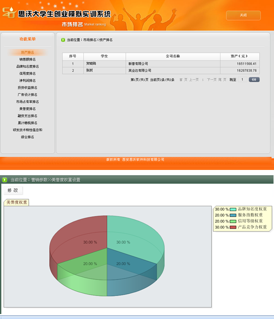 5、系統具有(you)(you)自動(dong)計分和手動(dong)評分功能。自動(dong)計分以各方面排(pai)(pai)(pai)名的(de)形(xing)式(shi),包括資金(jin)排(pai)(pai)(pai)名、銷售排(pai)(pai)(pai)名、知(zhi)名度(du)排(pai)(pai)(pai)名、利潤排(pai)(pai)(pai)名、投資收(shou)益排(pai)(pai)(pai)名、廣(guang)(guang)告設計排(pai)(pai)(pai)名、市(shi)場占有(you)(you)率排(pai)(pai)(pai)名、美譽度(du)排(pai)(pai)(pai)名、投融資收(shou)益排(pai)(pai)(pai)名、累計繳稅排(pai)(pai)(pai)名、綜合排(pai)(pai)(pai)名等。教師可以批閱學生所(suo)提交的(de)計劃書、廣(guang)(guang)告設計、市(shi)場調查分析、公司制(zhi)度(du)等。