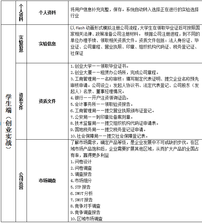 學生端(duan)模擬現實創業的(de)步(bu)驟(zou)及相(xiang)關流程進行創業實驗。